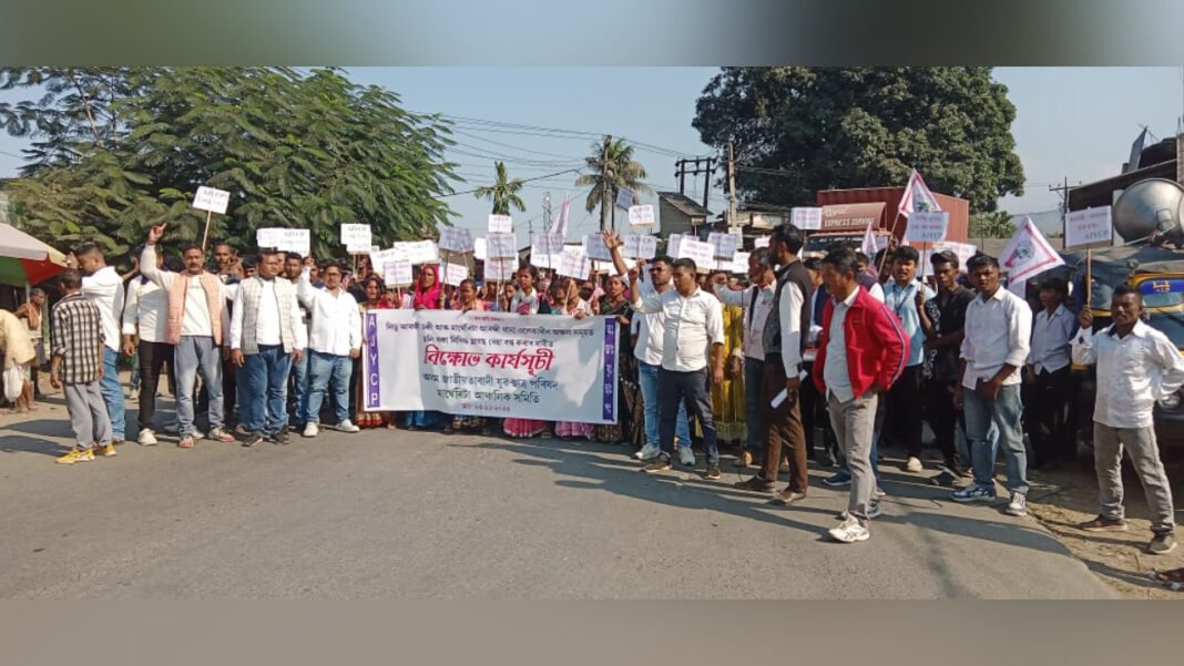 MARGHERITA, Dec 23: Members of the Asom Jatiyatabadi Yuba Chatra Parishad (AJYCP) Margherita Regional Committee, along with local residents of Ledo, staged a protest programme on Tuesday at NH-315 near Ledo College Tiniali, demanding an immediate and complete halt to the alleged unrestricted drug trade in the 83rd Margherita Legislative Assembly Constituency under Tinsukia district.
